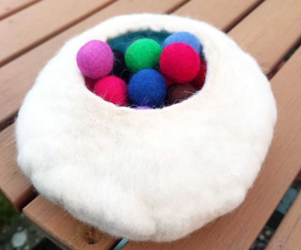 Lay out thin layers of wool on both sides of your resist, add soapy water, and felt as usual. Once the wool firms up, cut a small slit to remove the resist and continue felting until you have a sturdy bowl.